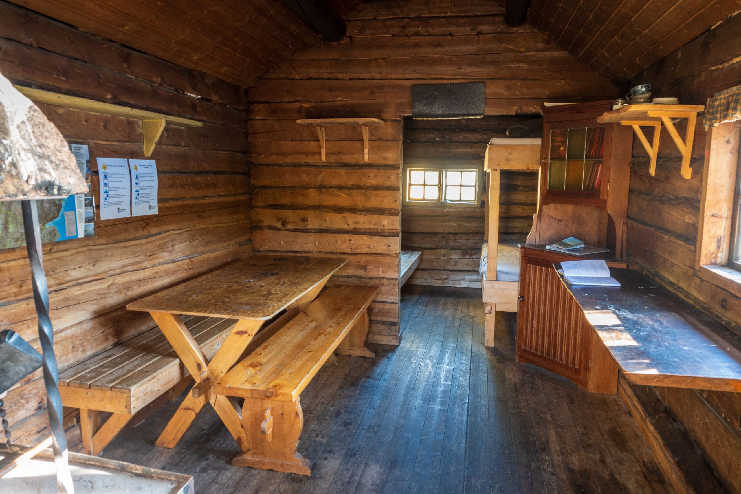 Kmalu smo prišli do prvega jezera in v bližini še do drugega. Že tukaj se nama je zdelo, da smo vstopili v nebesa. Na nabrežju je stala lesena koča, opremljena s 4 posteljami, mizo in klopjo ter kaminom s posodo za kuhanje. V njej lahko brezplačno prespi, kdorkoli si zaželi. V njeni okolici so nas navdušila tudi številna ognjišča s klopmi in v bivaku pripravljena drva. Poleg njih je bilo postavljenih tudi nekaj zelo kakovostnih žag in sekir, s katerimi si obiskovalci lahko nasekajo drva. Med opazovanjem vsega tega sva se spraševala, koliko časa bi pri nas trajalo, preden bi se orodje čudežno »izgubilo«.